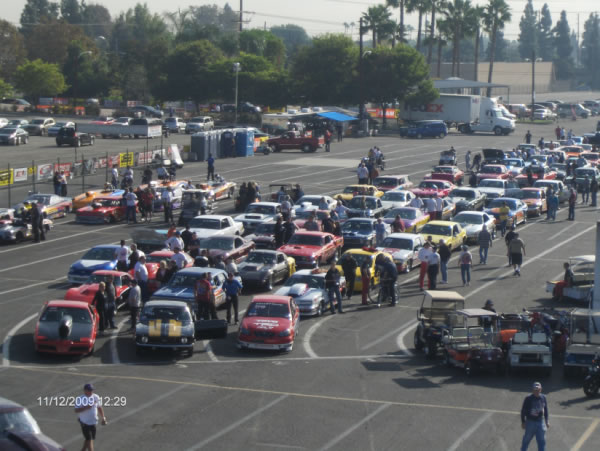 Super Stocks in staging lanes at Pomona, Mission Garage Firebird in lower left.